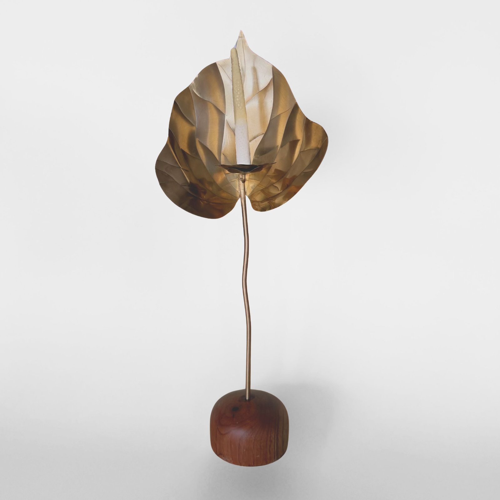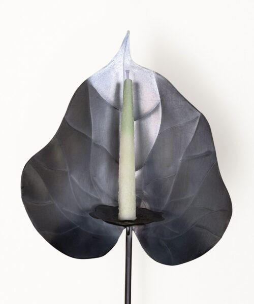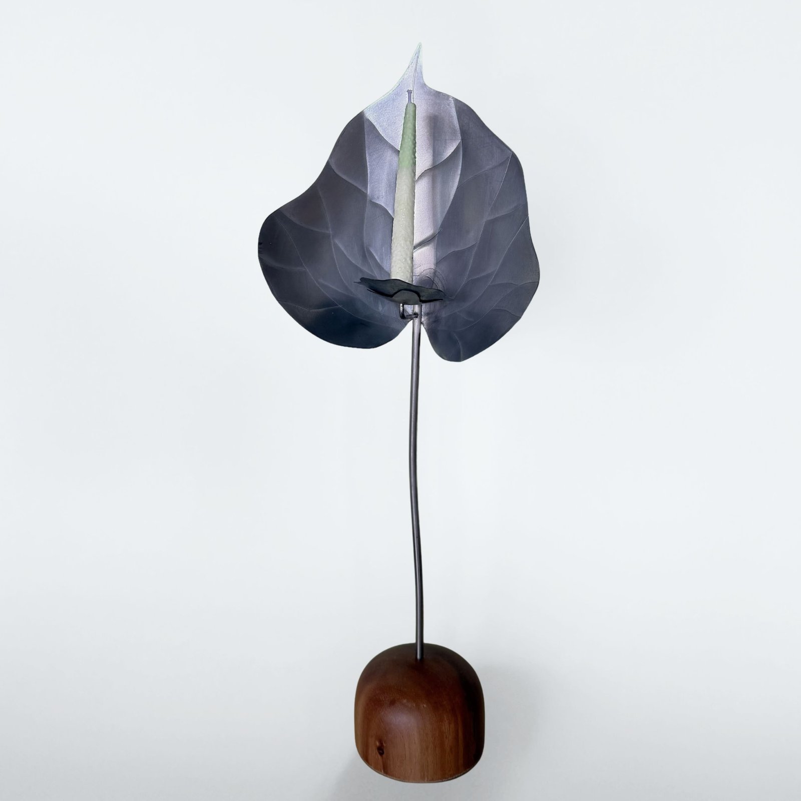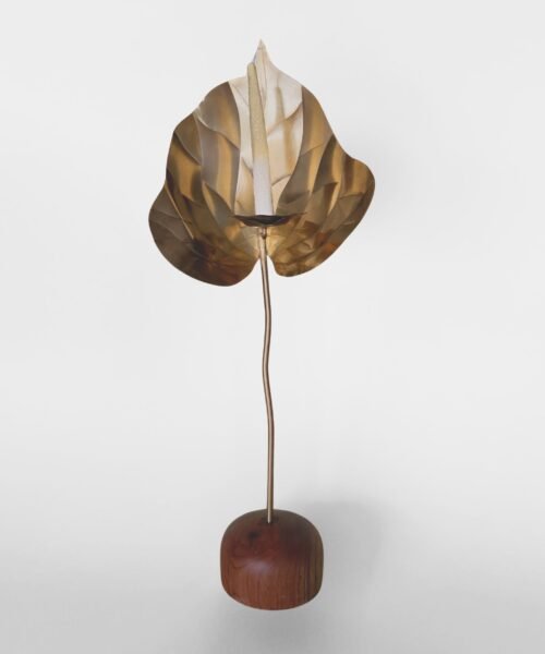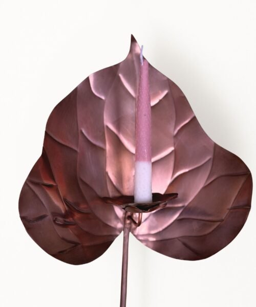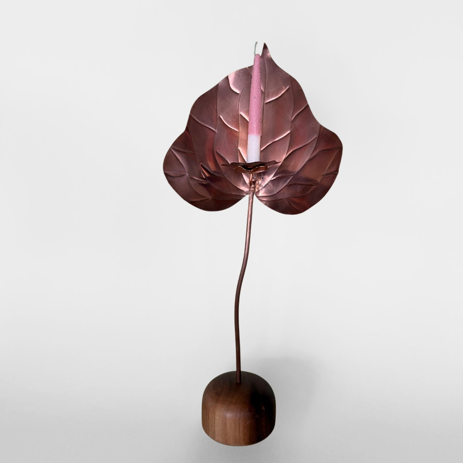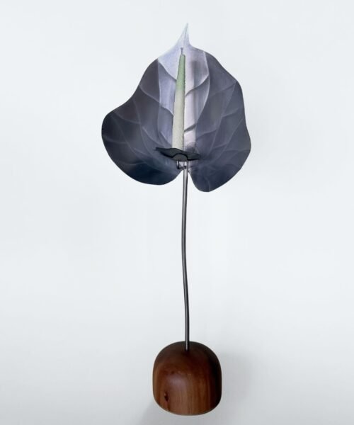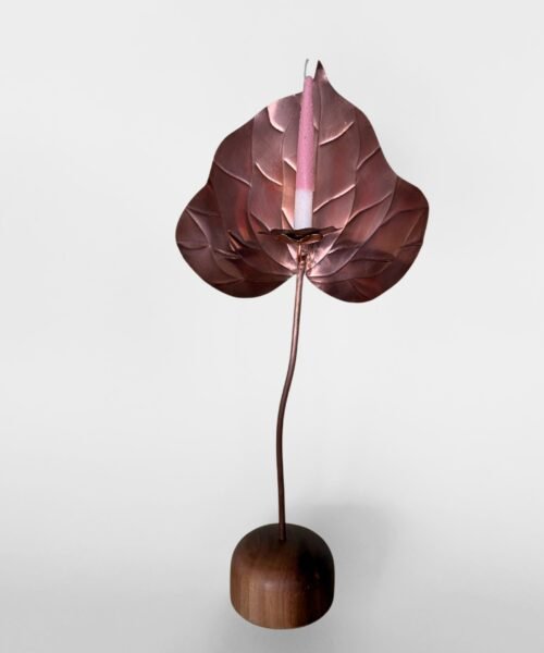 Escultura funcional de metal (cobre/bronce/acero) tallada a mano en forma de anturio con base de madera maciza y set de 10 velas de autor con forma y textura de pistilo