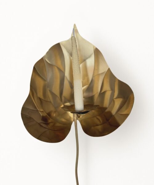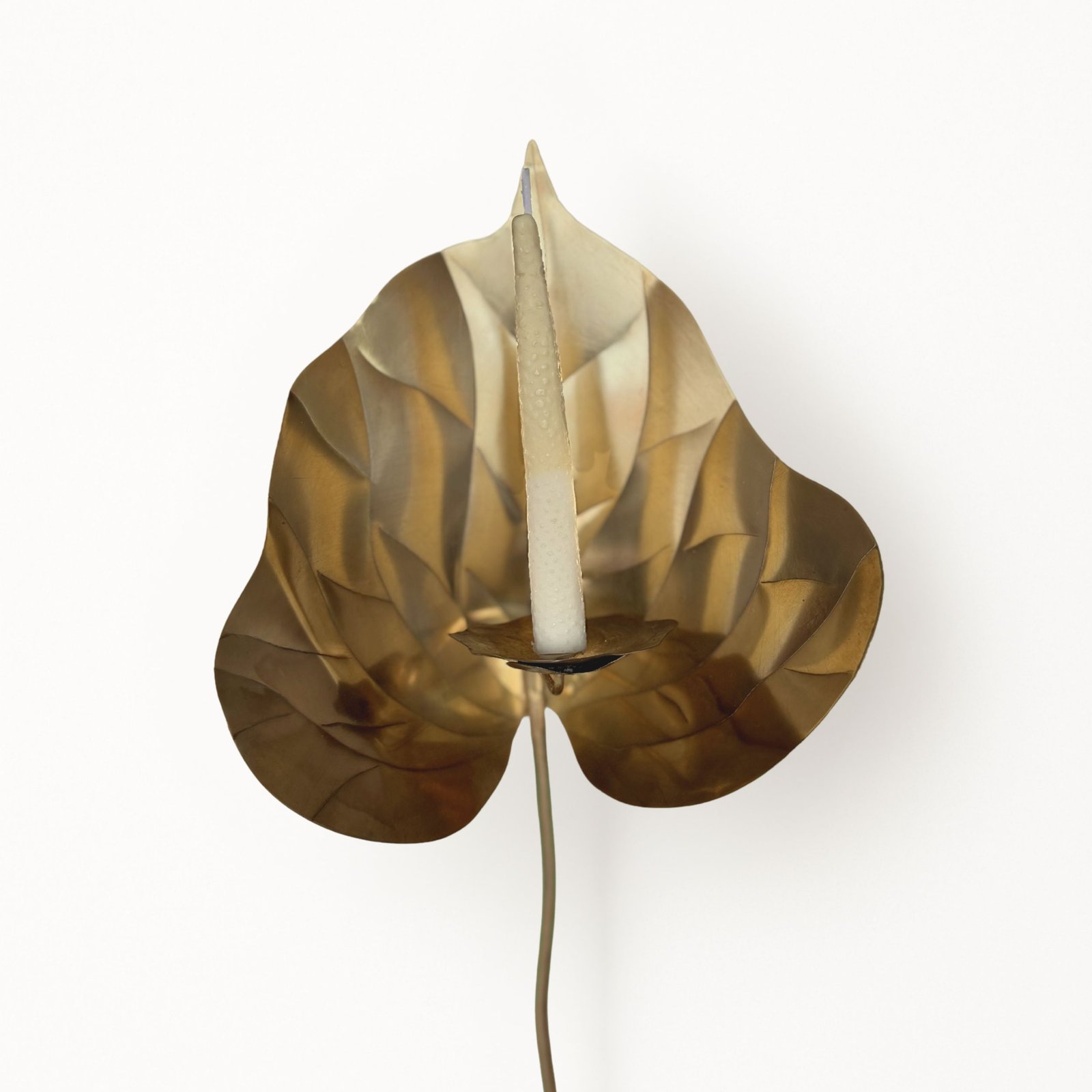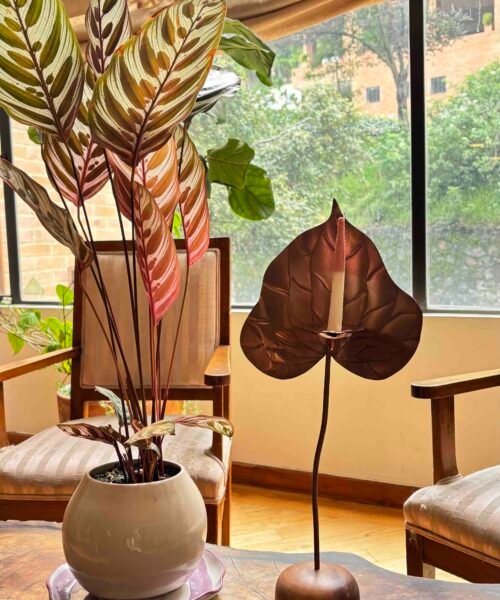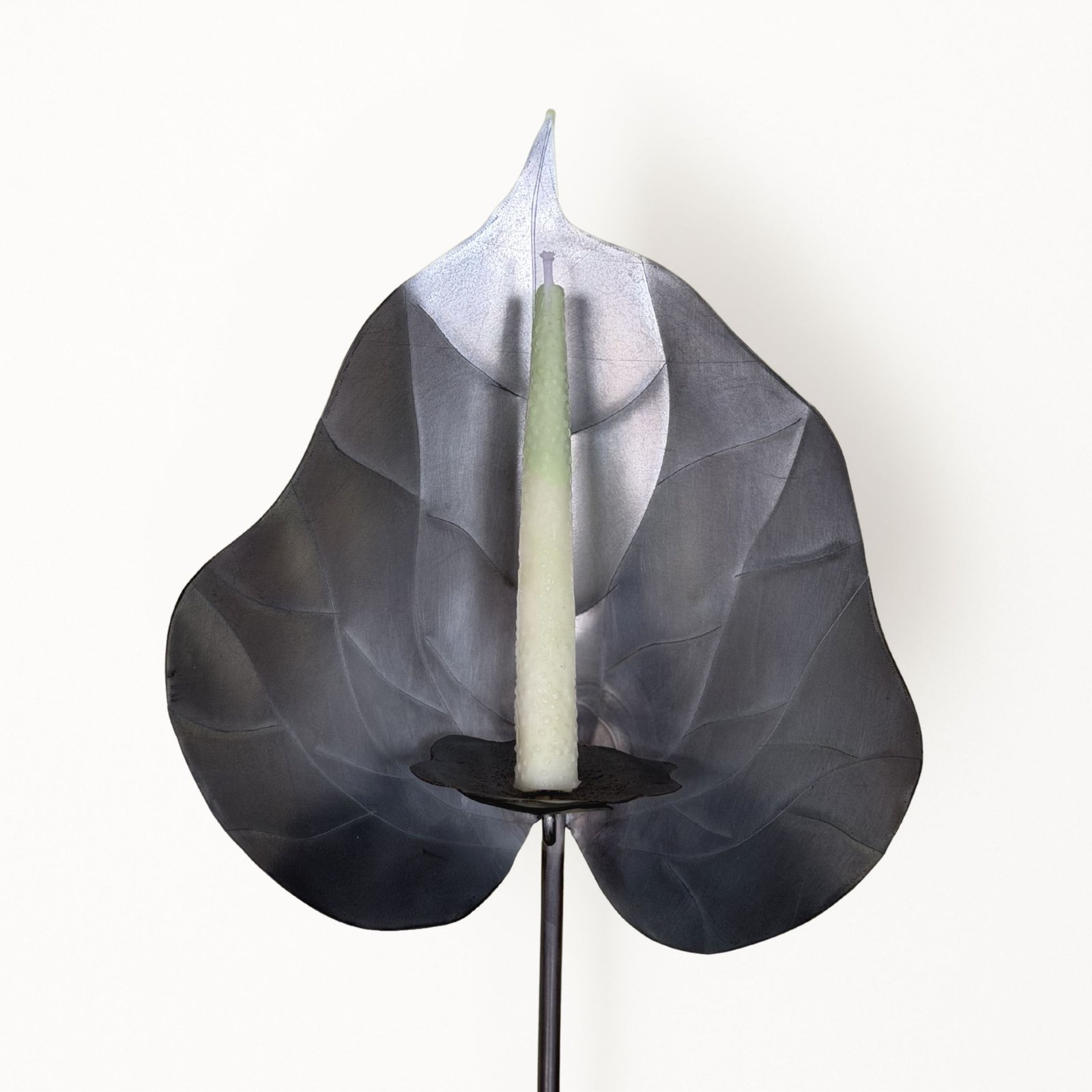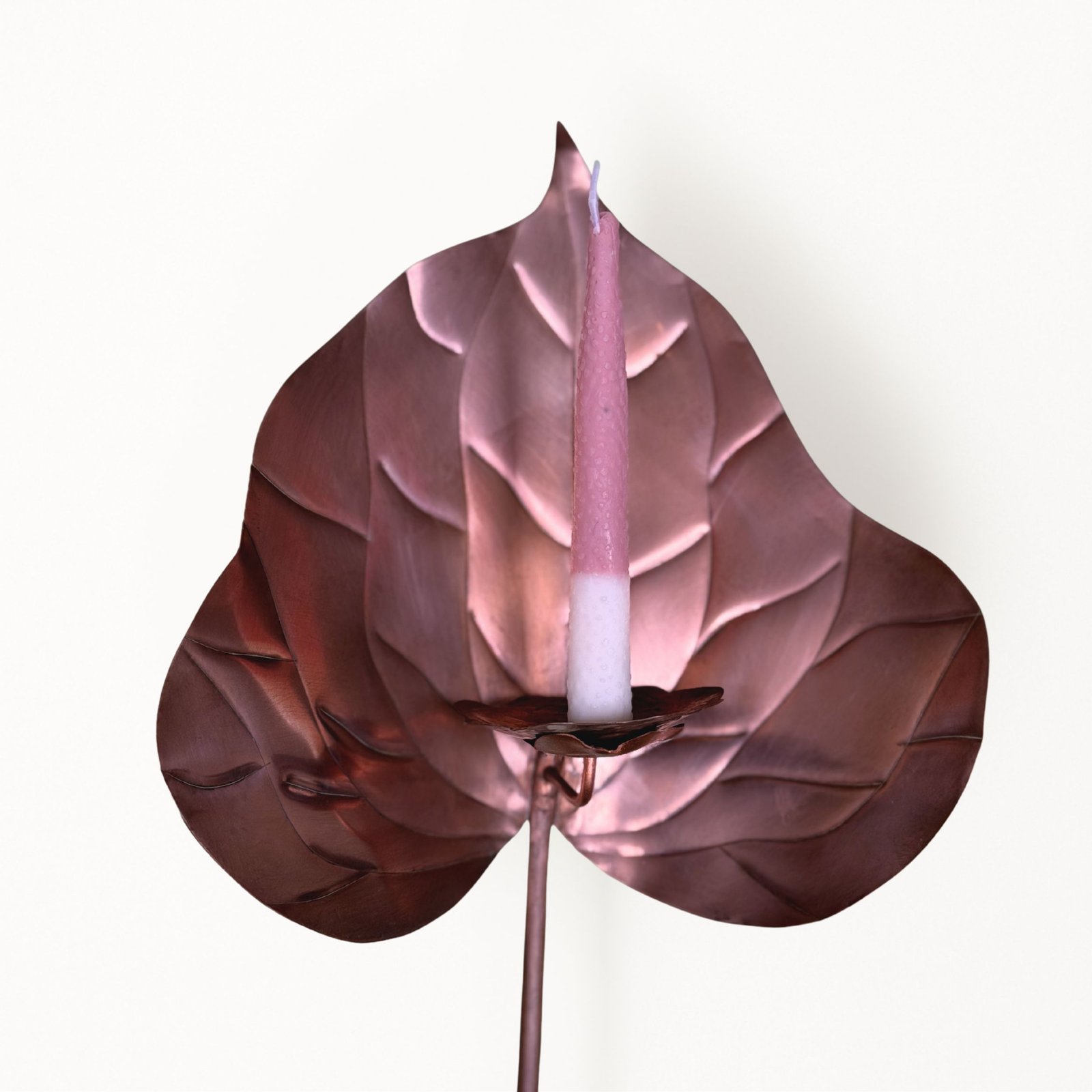 Escultura funcional de metal (cobre/bronce/acero) tallada a mano en forma de anturio con base de madera maciza y set de 10 velas de autor con forma y textura de pistilo
