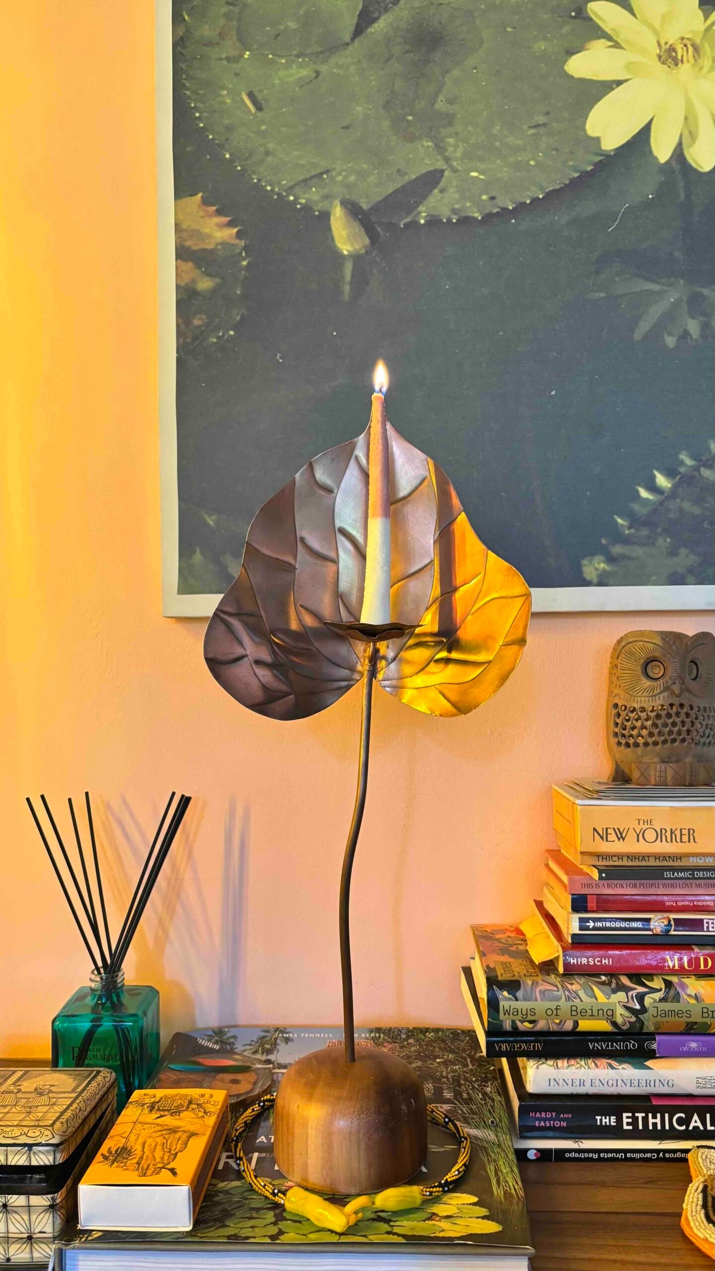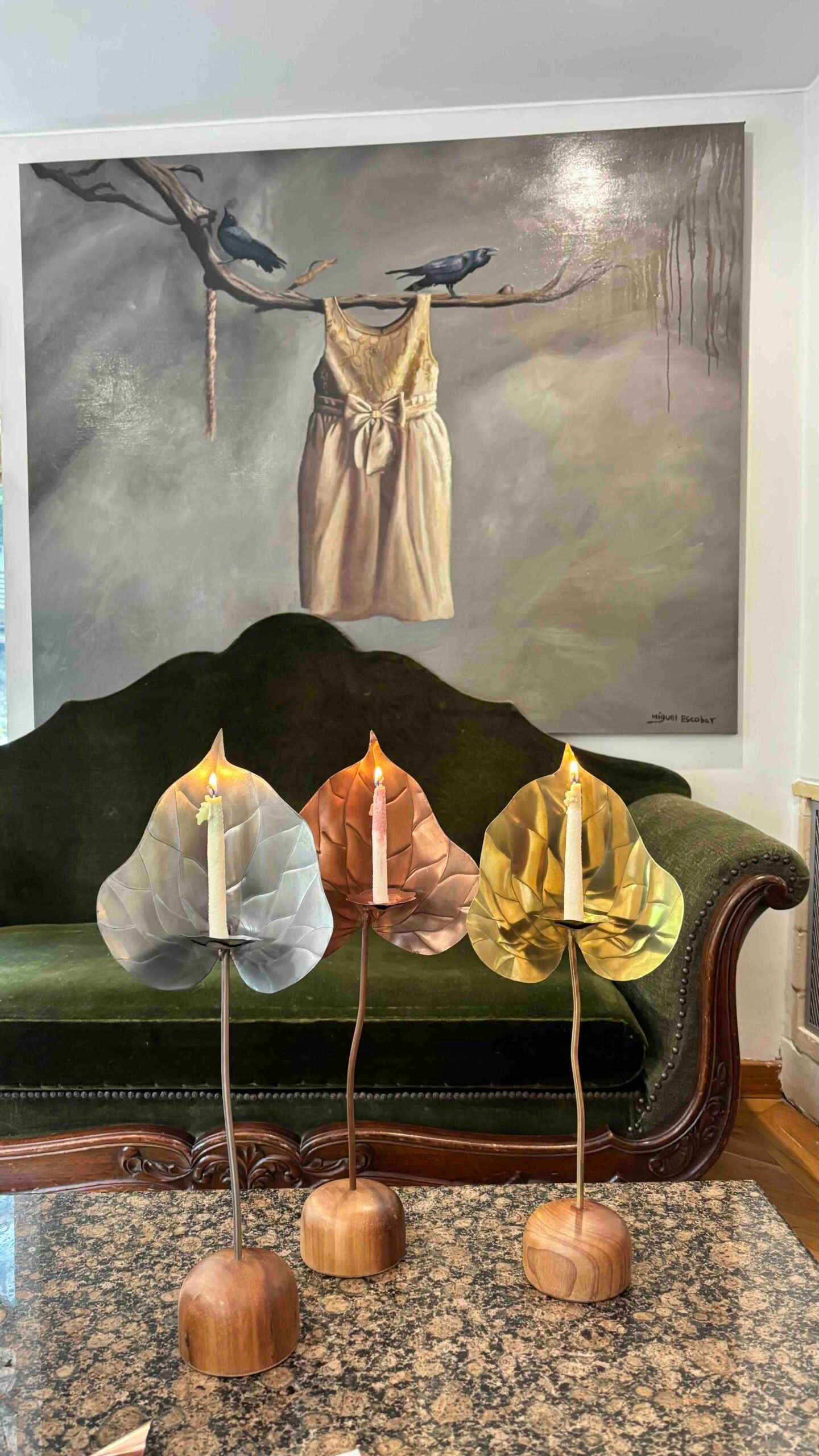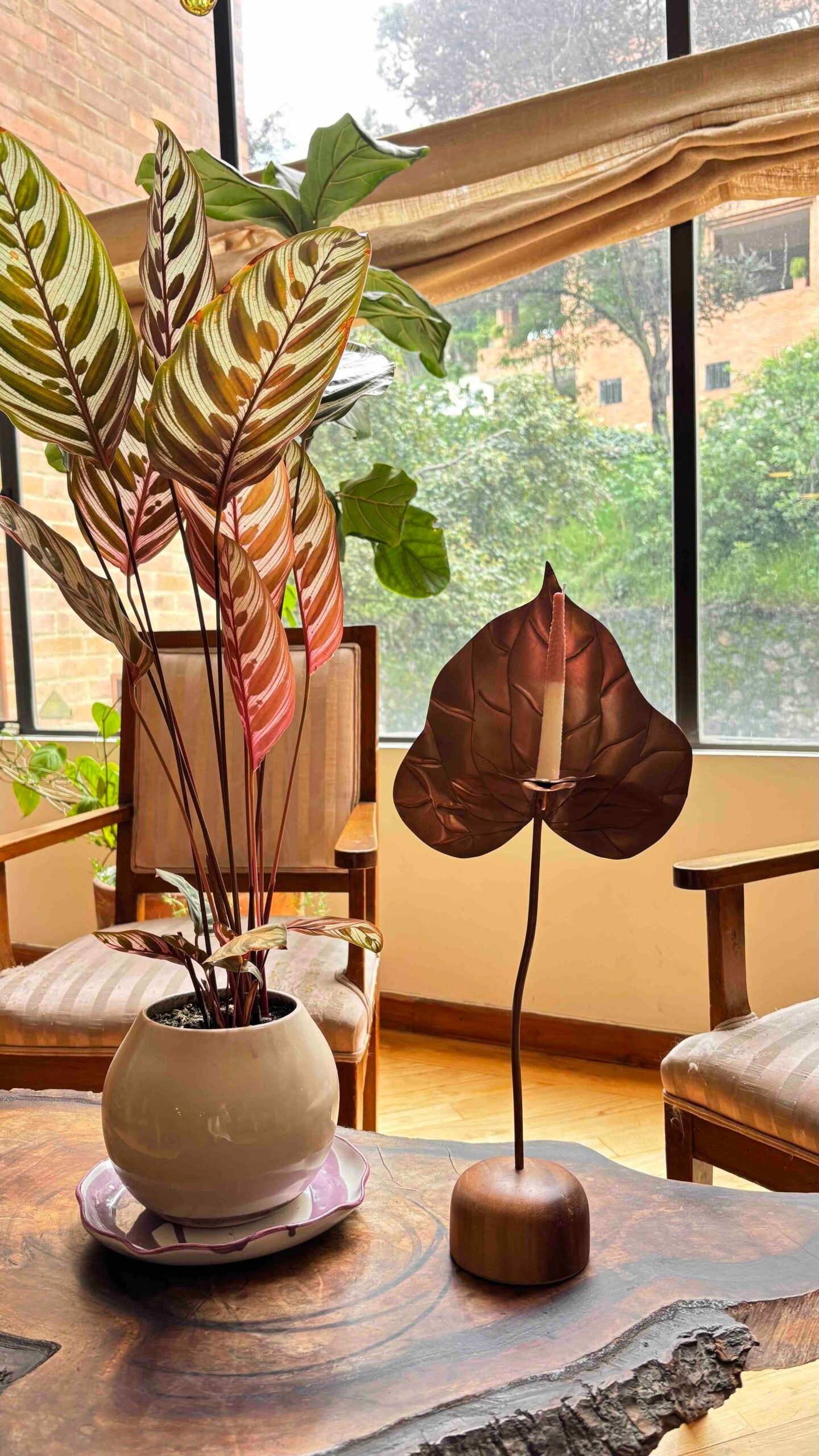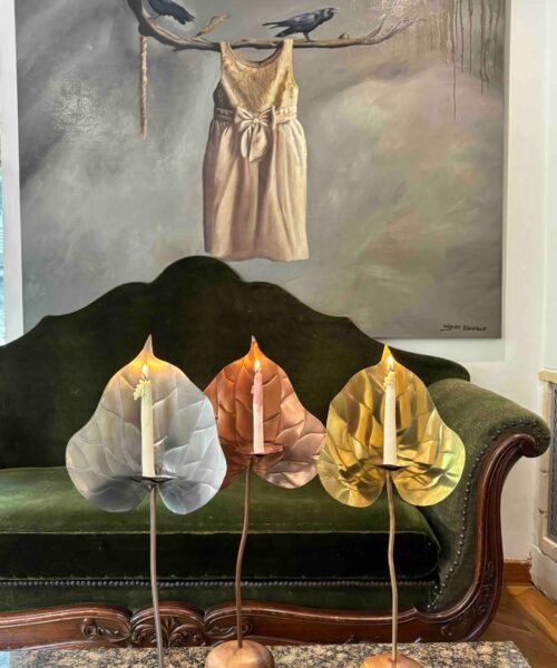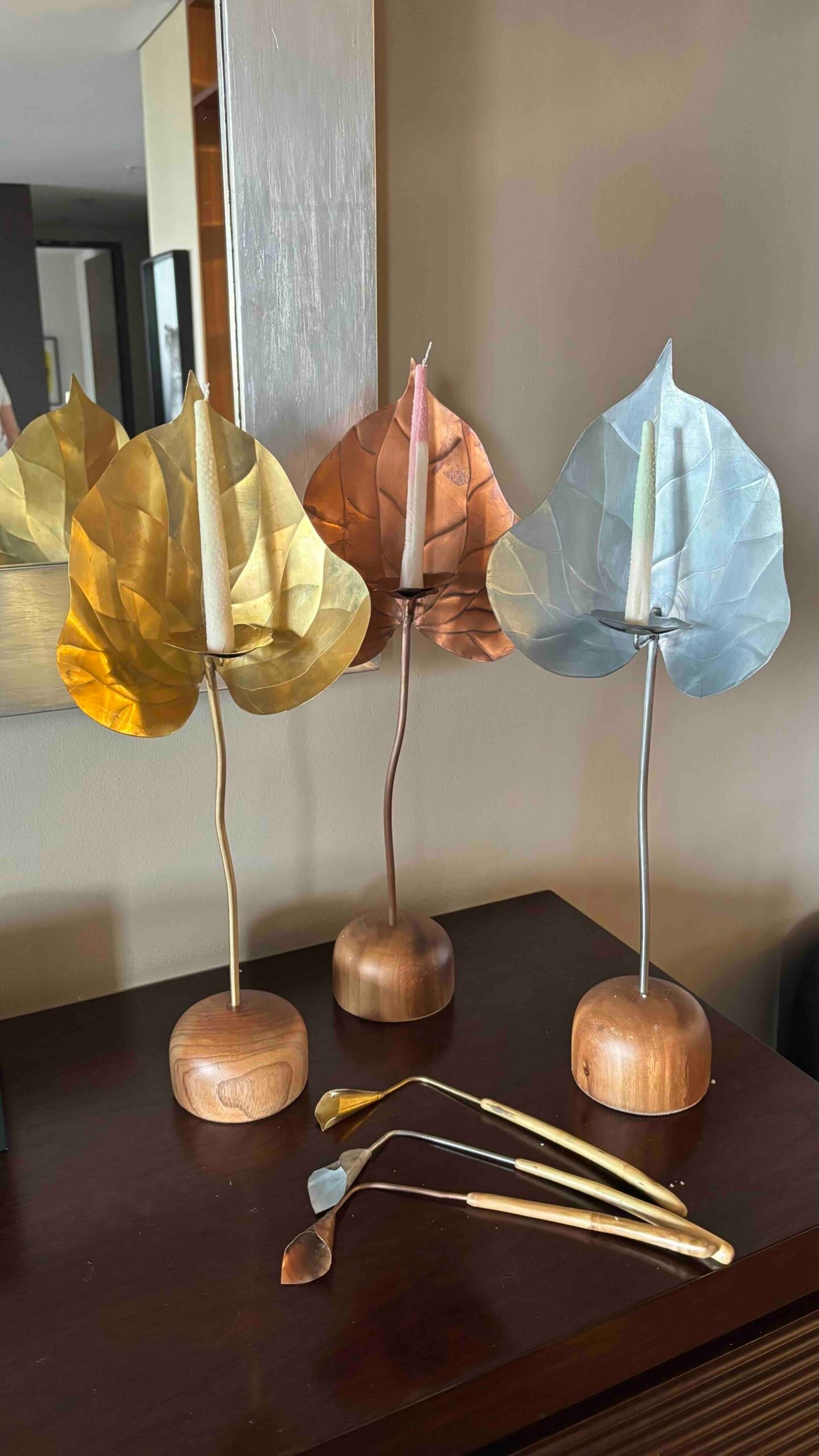 Escultura funcional de metal (cobre/bronce/acero) tallada a mano en forma de anturio con base de madera maciza y set de 10 velas de autor con forma y textura de pistilo
