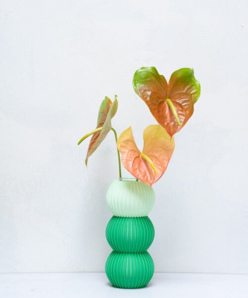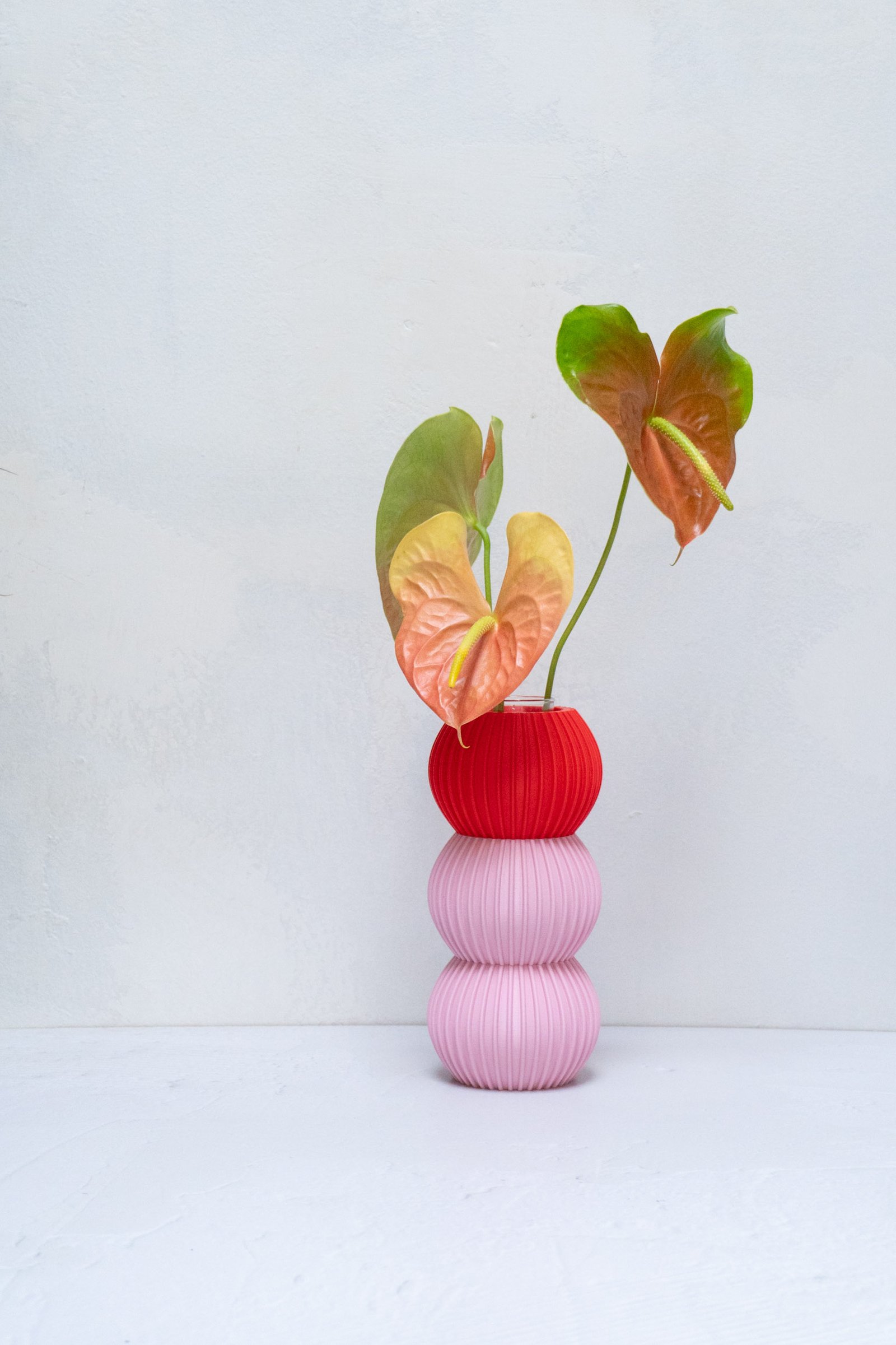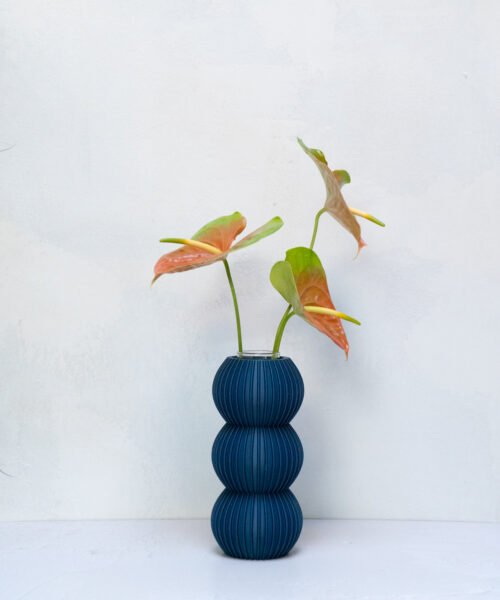 El florero cuenta con 4 piezas: el solitario en vidrio soplado artesanalmente, un pieza para la base de nuestro florero y dos piezas más que pueden conservar o intercambiar su lugar y tiene una medida de 9,5 x 9,5 x 20cm. Cada pieza es fabricada bajo pedido, debido al proceso de impresión 3D, puede haber variaciones en la textura y el color.