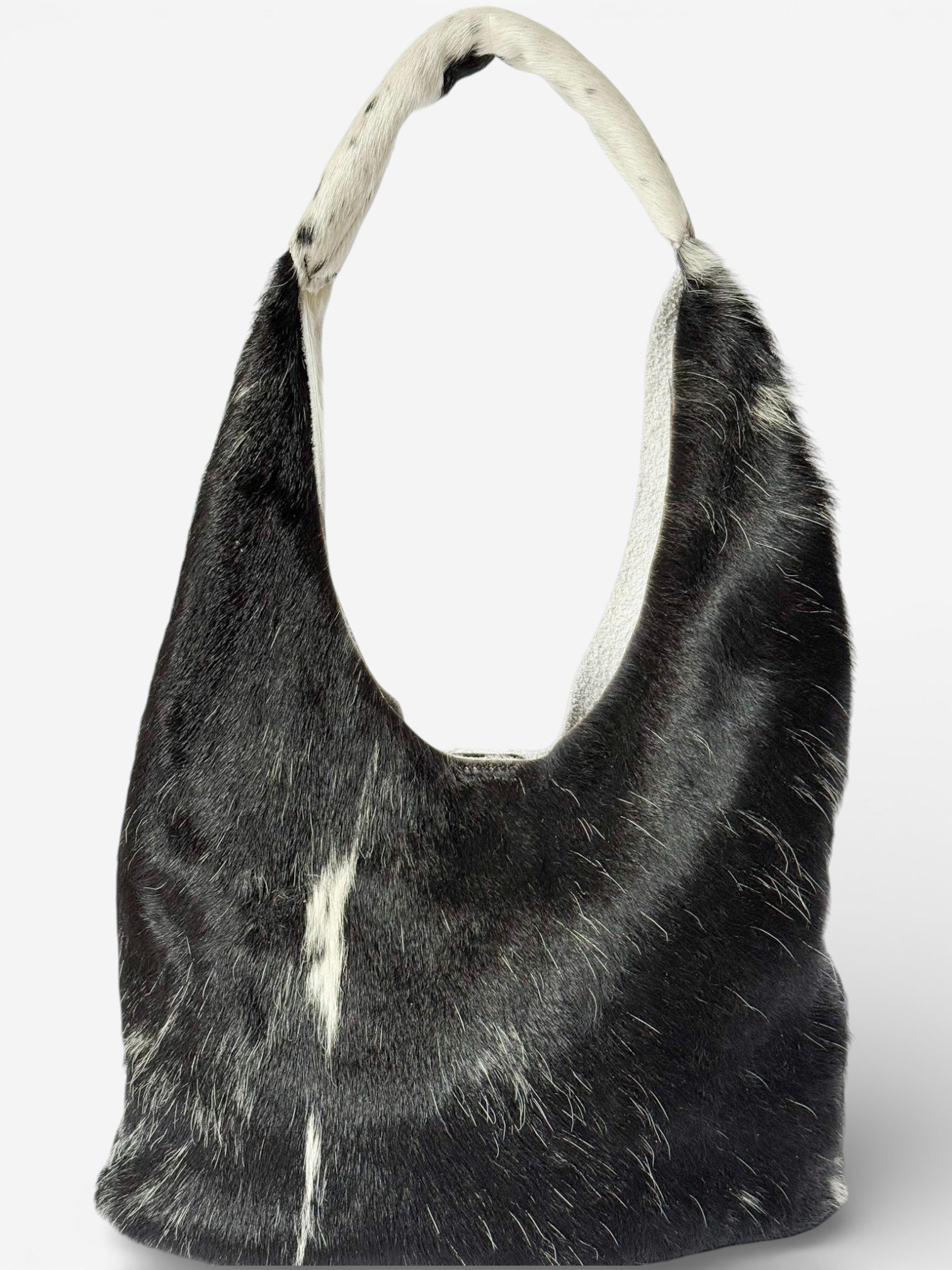 La cartera estrella es una declaración de estilo que no pasa desapercibida. Hecha con cuero pelo de vaca 100% colombiano, cada pieza es única, irrepetible y auténtica —con manchas naturales que pueden variar entre tonos grises o cafés, según la piel.